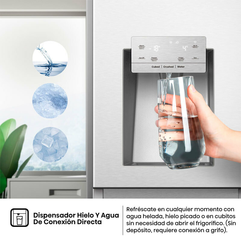 Su sistema No Frost garantiza una refrigeración uniforme sin la formación de hielo, eliminando la necesidad de descongelar manualmente. La capacidad total superior a 600 litros brinda un espacio óptimo para familias grandes o aquellos que requieren almacenar gran cantidad de alimentos. Los circuitos de frío independientes junto con la función de congelación rápida aseguran que cada alimento se conserve en condiciones ideales, manteniendo su frescura por más tiempo. La conectividad WiFi, combinada con el control táctil, permite ajustar la temperatura y supervisar el estado del frigorífico desde cualquier dispositivo móvil, ofreciendo comodidad y eficiencia energética. Con solo 38 dB de nivel sonoro, este frigorífico opera de forma silenciosa, asegurando un ambiente agradable en la cocina.