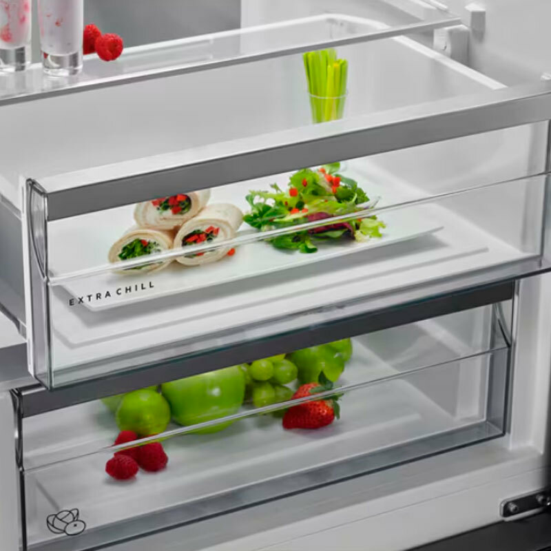 Este frigorífico ofrece iluminación LED tanto en su interior como en el display, mejorando la visibilidad y el acceso a los alimentos. Cuenta con tres estantes regulables y balcones ajustables para maximizar la organización según las necesidades del usuario. El innovador cajón ExtraChill mantiene la carne y el pescado en óptimas condiciones, mientras que el cajón para verduras con regulación de humedad prolonga la frescura de tus productos frescos. Además, sus puertas reversibles y patas regulables aseguran una instalación flexible y adaptada a cualquier espacio de cocina.