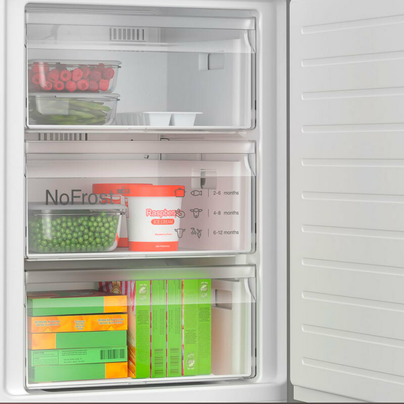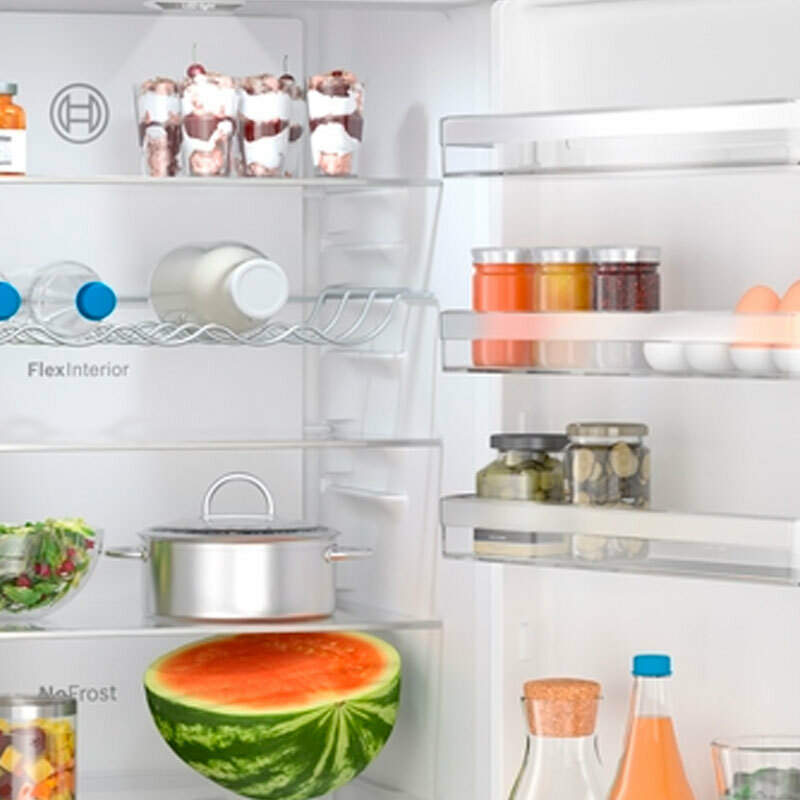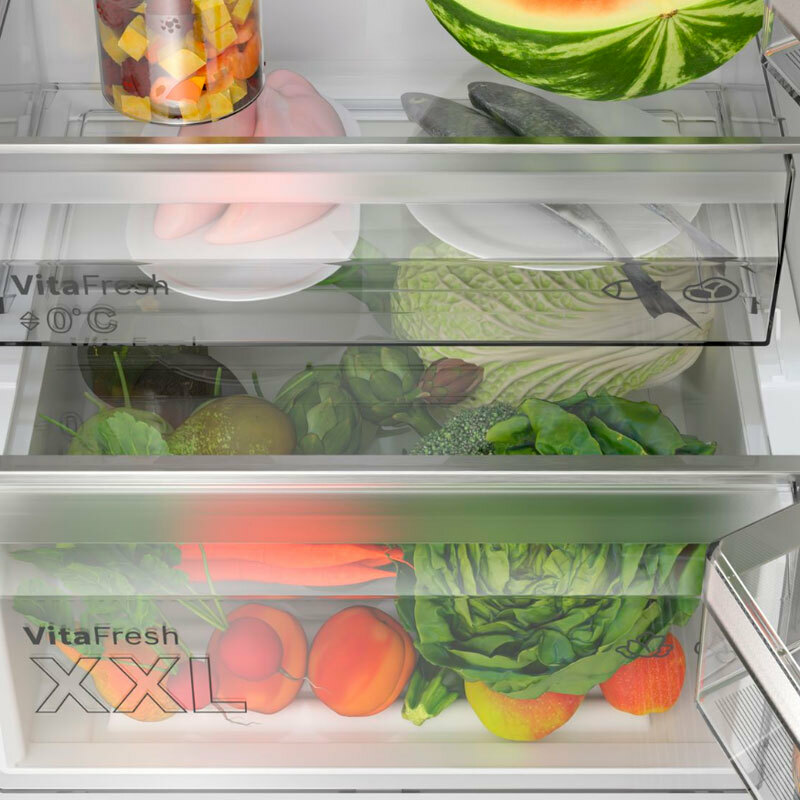 El frigorífico combina tecnología NoFrost con iluminación LED interior, lo que mejora la visibilidad y elimina la acumulación de hielo. Su sistema VitaFresh XXL 0°C crea las condiciones perfectas para alargar la vida útil de frutas, verduras, carne y pescado. Los dos circuitos de frío independientes permiten controlar la temperatura de manera precisa en cada compartimento, maximizando la eficiencia energética y el cuidado de los productos almacenados. Además, su funcionamiento silencioso contribuye a un ambiente doméstico más cómodo sin ruidos molestos.