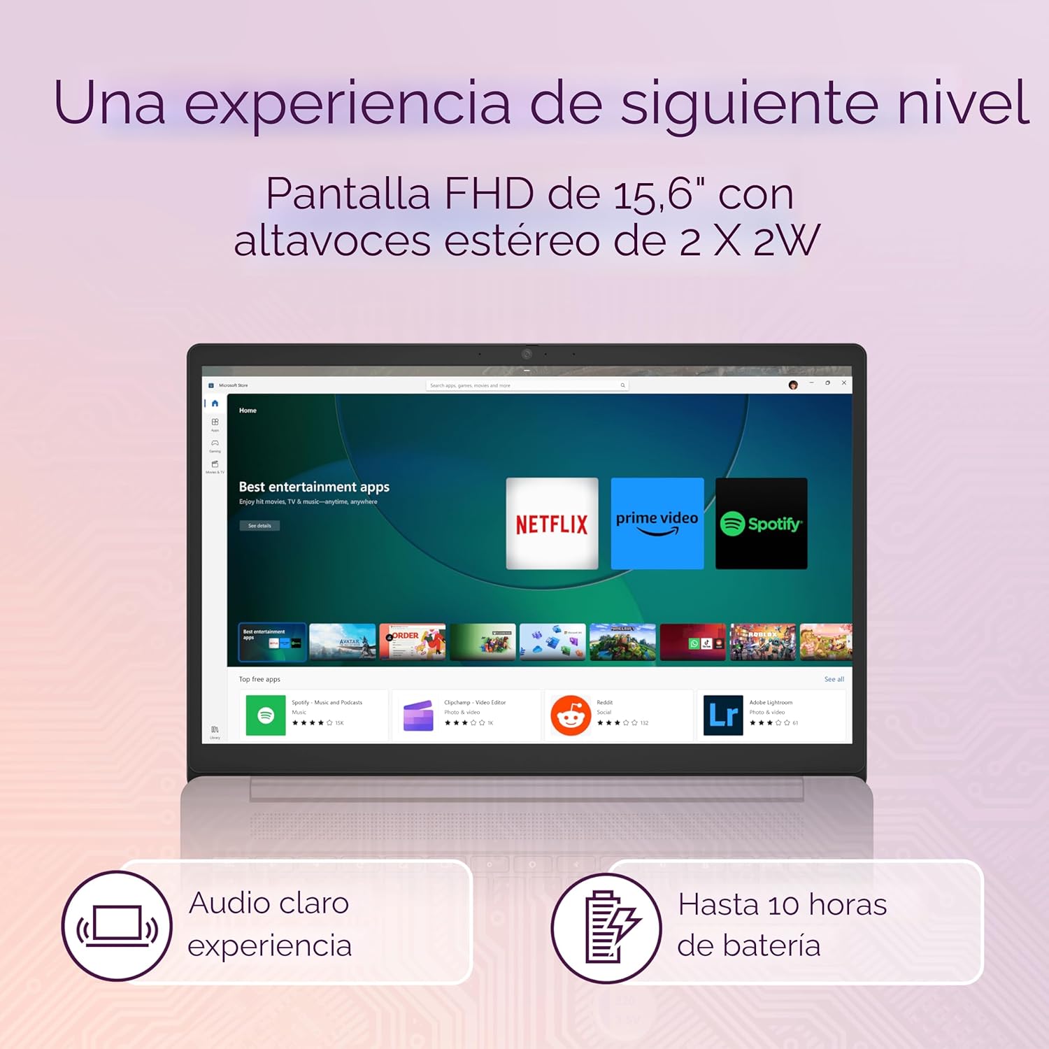 - Pantalla Full HD 1920x1080 de 15.6" que brinda imágenes vibrantes y detalles precisos